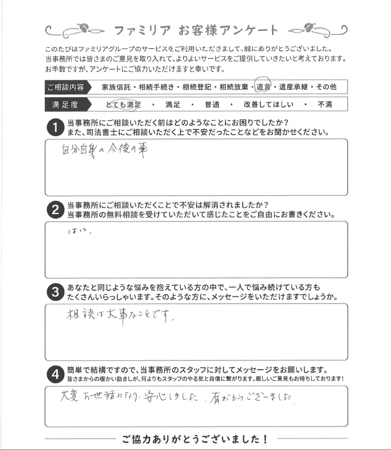 お客様の声|自分自身の将来への不安が、安心へと変わった遺言のご相談